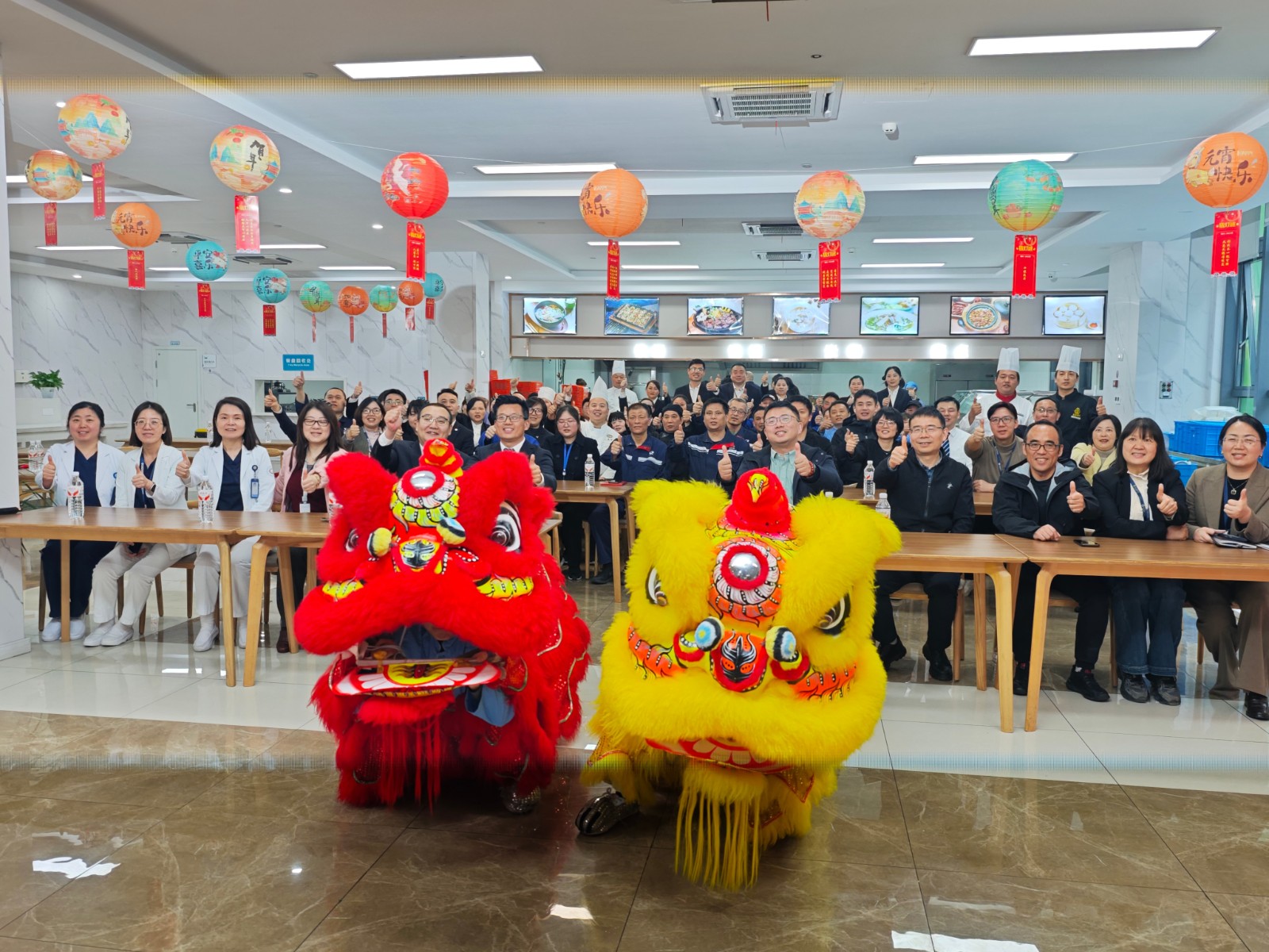3月2日,元宵节的前一天,浙大儿院食堂已是暖意融融。两头雄狮踏着铿锵的鼓点腾跃而起,金狮昂首、红狮甩尾,在大家的喝彩声中翻腾起舞。元宵未至,热闹已扑面而来。 这场由浙大儿院与求是物业共同举办的“团圆庆元宵·暖心共奋进”迎元宵主题活动,就在这喜庆氛围中拉开帷幕。 浙江大学医学院附属儿童医院副院长徐玮泽、院长助理沈小庆,求是物业公司总经理邓勇、副总经理唐盛勇出席活动,双方员工代表近百人共聚一堂,共享团圆时光。 &nbs